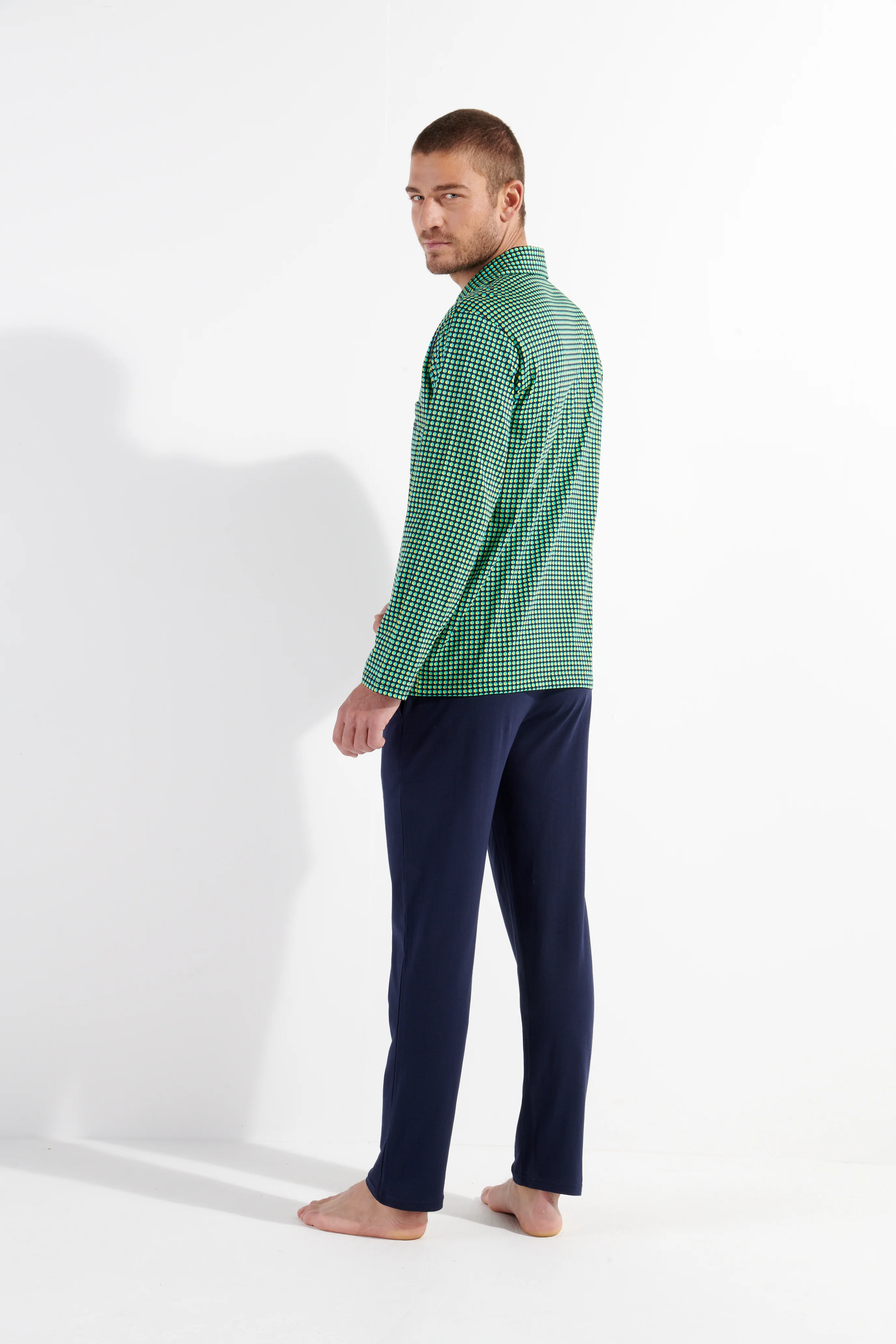 The FILIPPO pajamas are a coordinated two-piece in cotton and jersey knit. Its "shirt"-style pajama top is paired with pants. Its 3D-effect geometric cube motifs combine blue, yellow and green colors. They are deployed on the pajama top, in complete contrast to the plain, navy-blue pajama bottoms.
