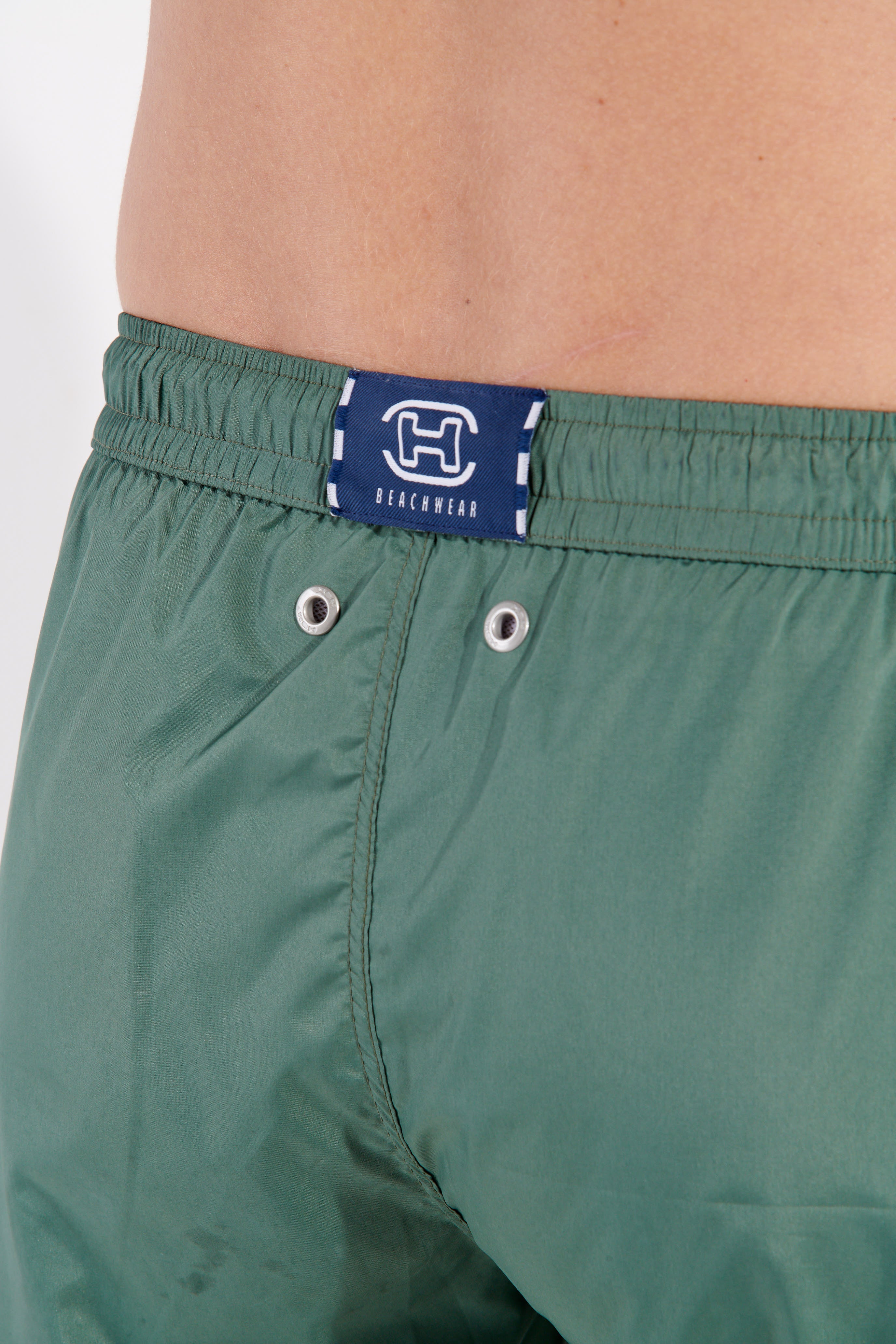These swim shorts are cut in a straight, medium-length thigh cut. This swimsuit is made from a fabric composed of 100% polyester. This material effectively resists chafing, doesn't wear out easily, doesn't loosen or deform over time and washes. For added comfort in movement, this swimsuit features a 100% polyester inner mesh. The polyester in the NAUTICAL CUP swim shorts is a synthetic fabric ideally suited to both wet and dry swimwear. It's a textile that also has the advantage of being fairly stretchy, wrinkle-free and guarantees good colorfastness over time of use. For this swimsuit, the fabric has been treated with a special water-repellent finish to facilitate drying. The NAUTICAL CUP swimsuit ties, at the front of the piece with a drawstring inserted into the fabric of the elastic waistband. It's two-tone, with contrasting colors adding to the swimsuit's sporty aesthetic. The lace ends are protected by silver-colored metal end caps. The swimsuit has been manufactured with discreet side pockets and a piped back pocket, closed with velcro. This swimsuit carries the OEKO-TEX® label. This international certification standard ensures the non-harmful nature of the yarn, fabric and dyes making up these swim shorts. It's a requirement that the professionals at HOM set for themselves for all the brand's underwear, swimwear and pajamas.